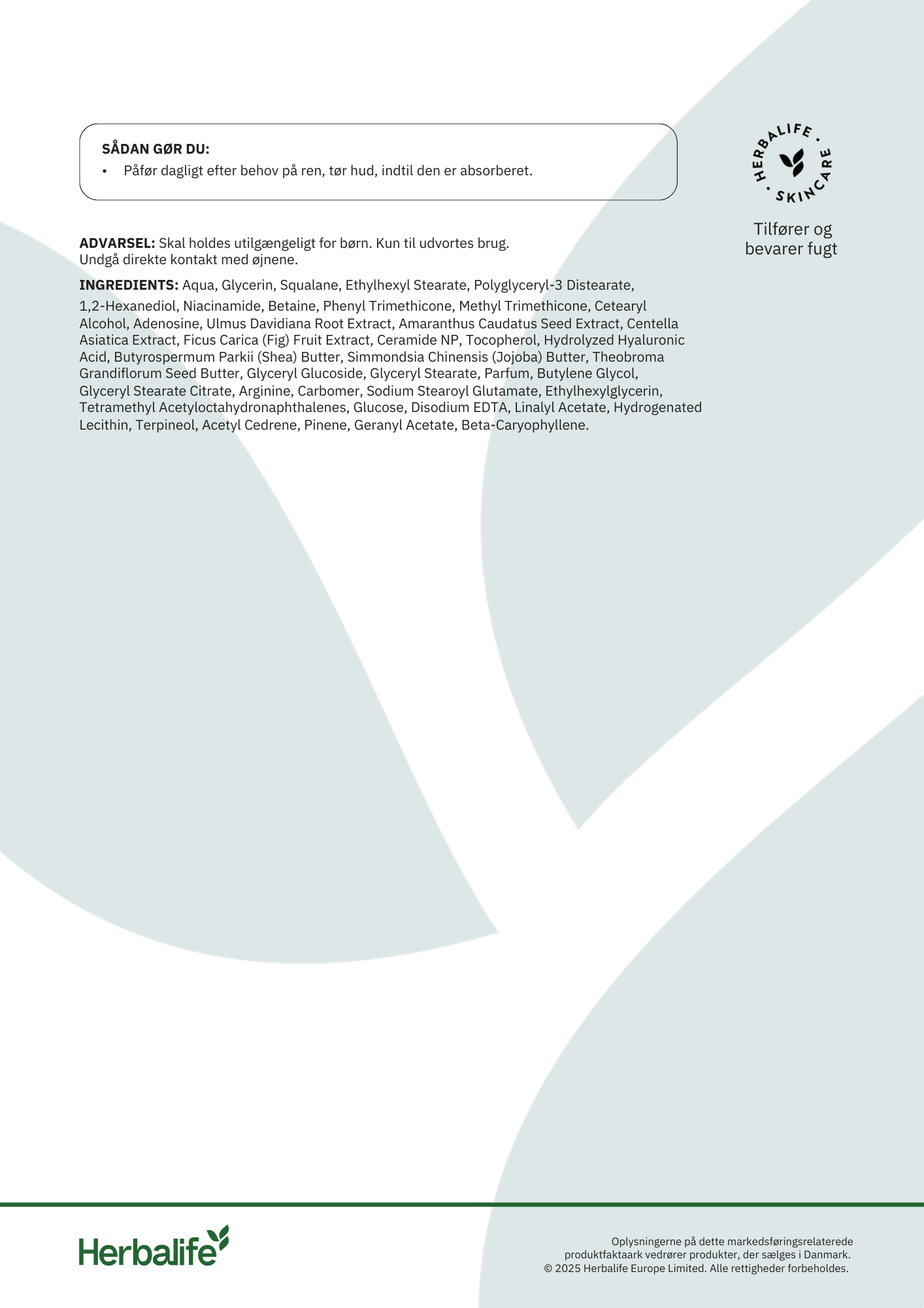 Påfør hånd-og bodylotionen dagligt efter behov på den rene, tørre hud, indtil den er absorberet.
